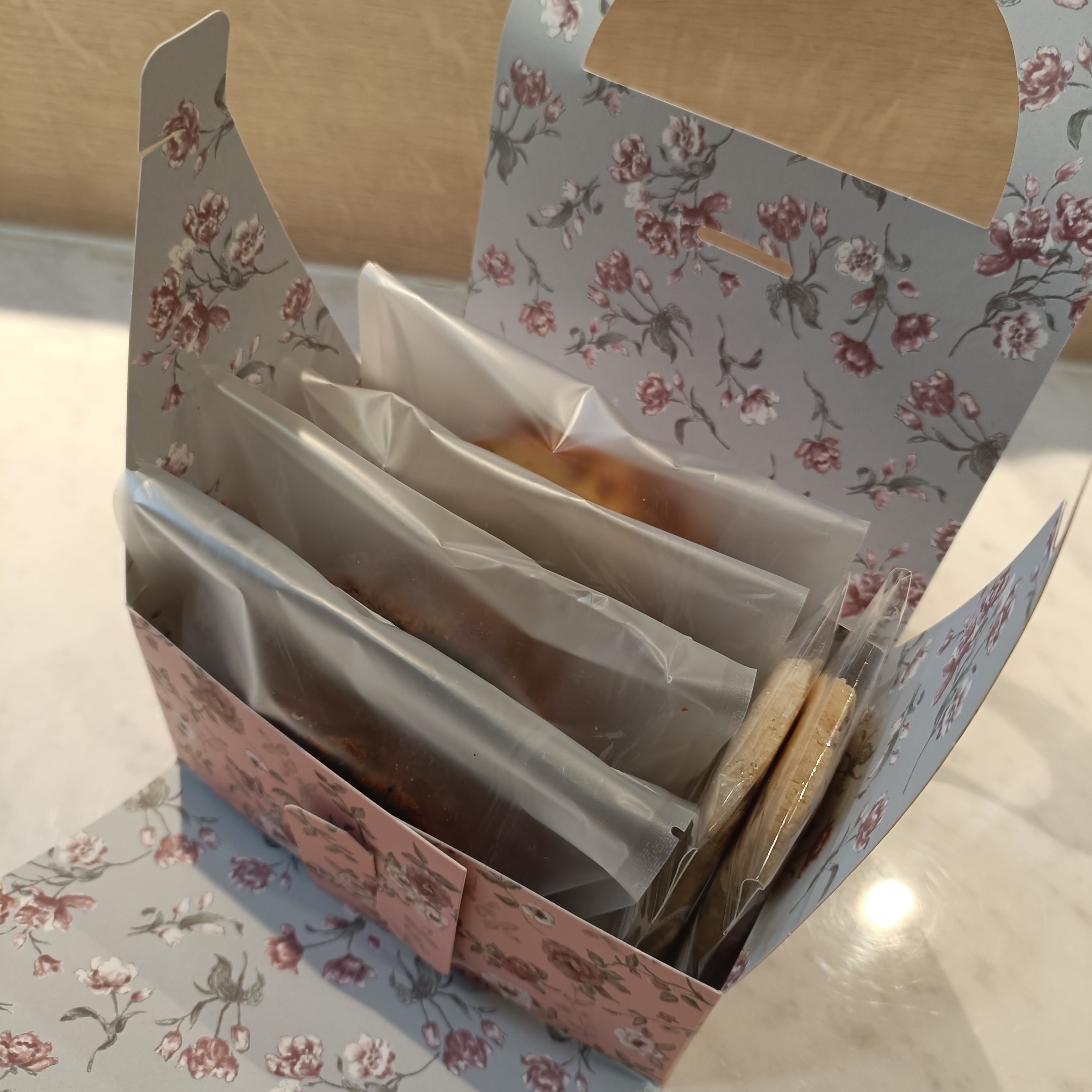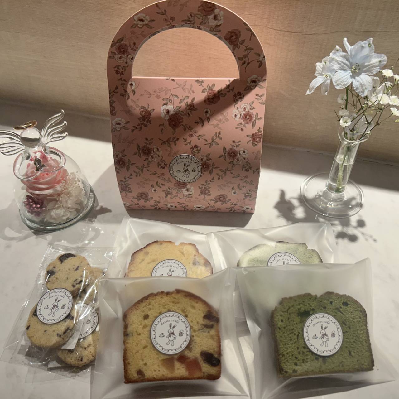 2cafeのオススメ焼き菓子がピンクの花柄の可愛い箱に入っています。