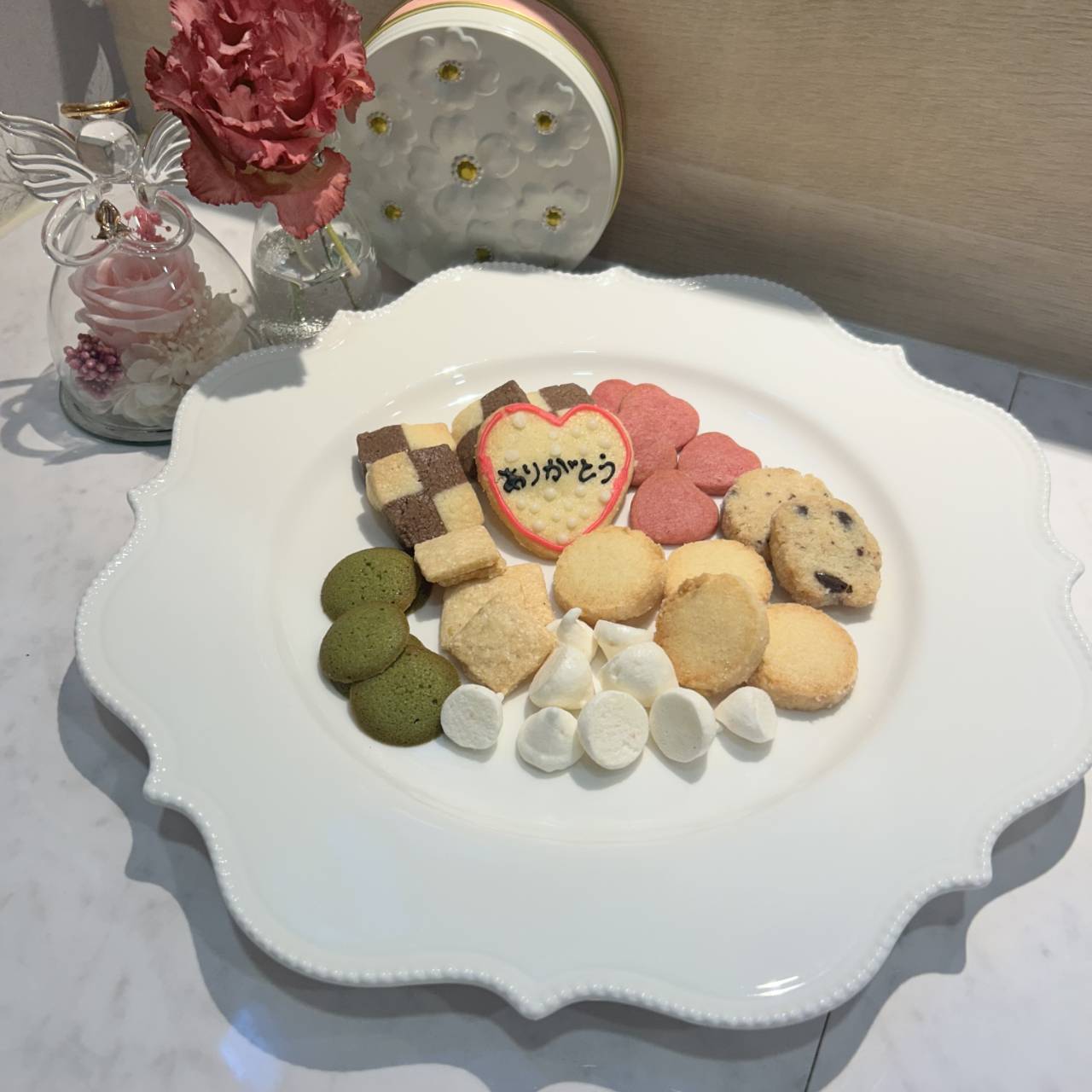 アイスボックスクッキー、ココナッツクッキー、チーズクッキー、抹茶のラングドシャ、イチゴクッキー、♡のアイシングクッキー